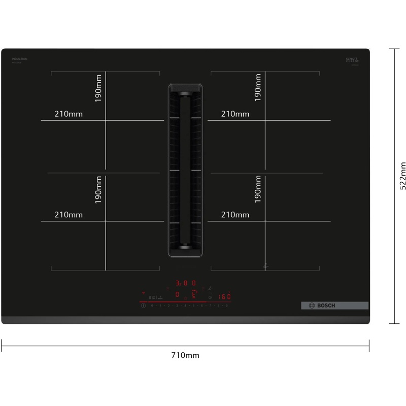 Placa de inducción Bosch PVQ731H26E con extractor integrado y 4 zonas de cocción utilizables simultáneamente. Potencia máxima de extracción de aire de 500 m³/h. Nivel de potencia sonora de 69 dB a velocidad máxima según normativa 2010/30/CE. Tipo de placa de inducción con sistema de extracción integrado. Terminación biselada. Dimensiones de 223 x 710 x 522 mm. Incluye conexión Home Connect. Configuración de cuatro zonas de cocción independientes. Datos técnicos indicados con dimensiones expresadas en milímetros, potencia de extracción en m³/h y nivel acústico en dB. Sistema de extracción integrado especificado como parte del dispositivo. Configuración diseñada para instalación en encimera. Parámetros técnicos indicados según especificaciones del fabricante con valores de dimensiones, número de zonas y rendimiento de extracción.